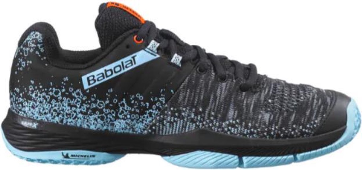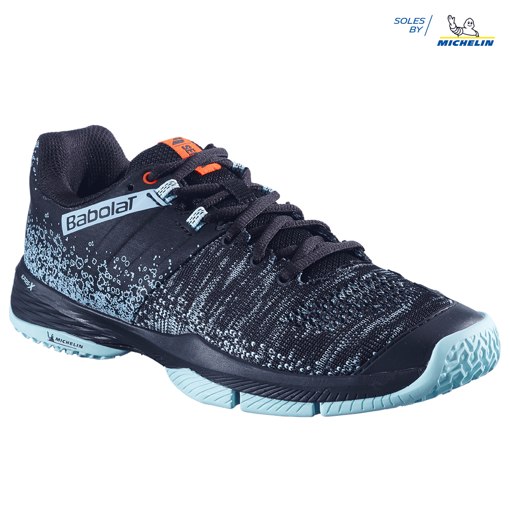 Presteer het best op de padelbaan met de Babolat Padelschoenen Sensa Dames. Het betreft de nieuwe 2021 collectie van Babolat. De padelschoenen vallen op door het zwarte design met de details en de turquoise zool. Een super strak design. Het zijn high-end padelschoenen, licht, comfortabel met een super zool voor padel. De padelschoen heeft een twee flex-inkepingen zool om je voet een maximaal contact met de grond te geven, zo verbeter jij je bewegingssnelheid. Daarnaast is de padelschoen van een Michelin-zool voorzien. Michelin en Babolat hebben namelijk samen een zool ontworpen die voor elke maat schoen geperfectioneerd is. De nieuwe S-vormige zool zorgt voor nog meer grip en speelcomfort. Al om al een top padelschoen voor dames die het meeste uit hun padel spel willen halen.